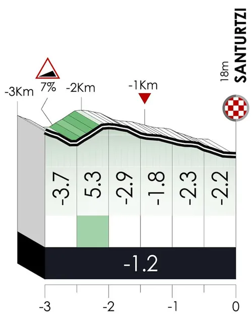 Na het bereiken van de top duiken we een snelle afdaling in richting Santurtzi, een plaats ten noordwesten van Bilbao. In de laatste drie kilometer krijgen we dan nog een kort stukje bergop, om uiteindelijk in dalende lijn te finishen. We gaan dus sowieso te maken krijgen met snelle laatste kilometers!