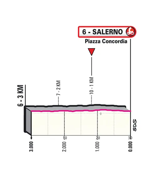 De laatste zestig kilometer verlopen in licht dalende lijn. Wanneer finishplaats Salerno wordt bereikt, is het alweer een tijdje vlak geweest. Wat vooral opvalt is dat er gedurende de laatste zestien(!) kilometer geen enkele scherpe bocht meer wacht. Op vier kilometer van de streep moeten de renners wel rechts aan houden om de stad in te duiken, maar verder zijn het alleen maar rechte wegen. Het is zeker breed genoeg om de treintjes naast elkaar op te zetten en te gaan sprinten, tenzij de aanvallers natuurlijk kunnen verrassen.