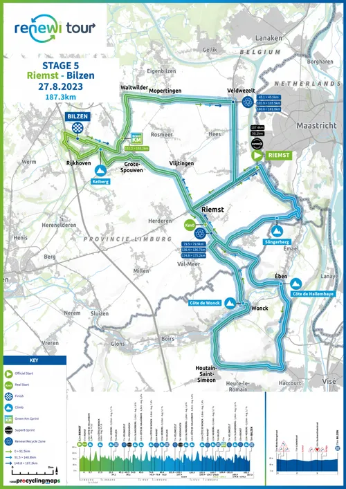 de Renewi Tour zondag met een rit van 187 kilometer van Riemst naar Bilzen, waarin de coureurs nog een heleboel hindernissen te wachten staan. De gehele dag gaat het op en af in de omgeving van deze twee plaatsen, waardoor we toch wel een spektakel mogen verwachten om de rit- en eindzege van deze