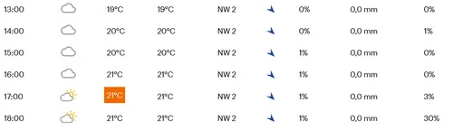 De renners hoeven gelukkig een keer niet te rekenen op natte helmen of kletsnatte bochten. Vrijwel de gehele middag is het meer dan prima koersweer. Het wordt zo'n negentien tot eenentwintig graden met een niet al te sterke wind vanuit het noordwesten. Dat betekent dat de renners vooral in het middenstuk van de etappe de wind mee hebben.