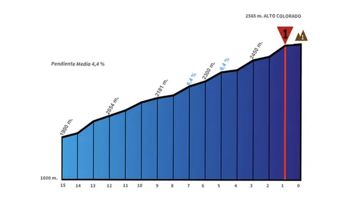 Het echte werk begint als we aankomen aan de voet van de Alto Colorado. Deze immense col van 18,8 kilometer is met 4,4 procent gemiddeld niet al te steil, maar de afgelopen edities hebben wel aangetoond dat er wel degelijk verschillen kunnen worden gemaakt. Met een lengte van bijna 19 kilometer, stukken boven de 6 procent en de top op meer dan 2.600 meter is deze col om heel andere redenen zwaar te noemen.