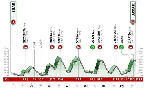 Net als de hele week is het klimmen en dalen van start tot finish, maar dan wel nog net een beetje zwaarder. Vanaf de Elkorrieta (met de top op 13,5 kilometer) wordt het loodzwaar. De beklimmingen zijn nergens langer dan tien kilometer, maar zijn wel steiler. Met slechts 135,7 kilometer kan het van start tot finish weleens oorlog worden tussen de klassementsrenners, die nog heel dicht bij elkaar staan in de rangschikking.