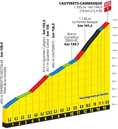 Vanuit de Tourmalet dalen we via Bareges af naar Pierrefite-Nestalas, waar we aan de slotklim naar Cauterets beginnen. Deze is 16,2 kilometer aan een stijgingspercentage van 5,3 procent, maar dat is niet het hele verhaal. De eerste elf kilometer zijn namelijk ook als vals plat te betitelen, alvorens het twee kilometer in de zwarte cijfers gaat.
