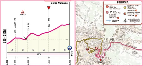 40,6 km: Perugia (6,5 km aan 4,0%, eerste 1,3 km aan 11,8%)