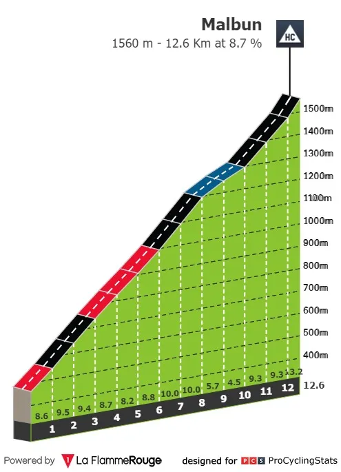 Die finale wordt zwaar, heel zwaar. De klim naar Malbun is 12,8 kilometer lang, aan gemiddeld 8,4 procent. Een ontzettend zware beklimming, met veel stroken boven de 10 procent. Richting de top vlakt het nog enigszins af, om naar de top af te sluiten met nog drie zware kilometers boven de 9 procent. Alle remmen los, dus!