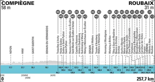 Parijs-Roubaix op zaterdag al tijdens hun debuut, de mannen gaan er zondag overheen. 257 kilometer staat er op papier, met in totaal 31 (!) kasseistroken. 55 kilometer dokkeren, met alle bekende martelingen erin gestopt. We starten in Compiègne en rijden bijna honderd kilometer totdat we de eerste kasseistrook aandoen. Het is een fase waarin je de wedstrijd niet kan winnen, maar wel al kan verliezen. En als het hier niet is, strepen we doorgaans al enkele favorieten door als de stroken Troisvilles à Inchy, Viesly à Quiévy en Quiévy à Saint-Python zich aandienen; twee stroken van drie sterren, eentje van vier.