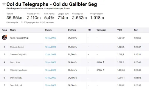 Hoe verschroeiend hard het - mede door een lekker windje mee - ging, blijkt wel uit de KOM die uit de boeken werd gereden op twee segmenten. De combinatie Télégraphe-Galibier (35,65 kilometer) werd door Pogacar in 1:26.55 uur afgewerkt. Dat was minuten sneller dan de oude toptijd, die niet eens meer in de top tien van deze
