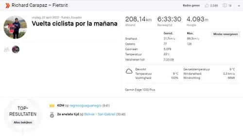22 april registreerde. Hij reed 208,14, overbrugde 4.093 hoogtemeters én reed dus een KOM uit de boeken. En dat allemaal rond Tulcán, een plaatsje in Ecuador op 2.980 meter hoogte.