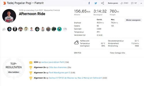 Strava-upload van Pogacar kijken we vooral naar de laatste kilometers, waarin de Sloveen z'n concurrenten uit het wiel sprintte en daarmee de gele trui voor zich opeiste. Pogi denderde de slotklim op aan zo'n 30 per uur, maar haalde een piek van 54. In zijn sprint naar de finish was hij nogmaals in staat de 50 kilometer per uur te passeren. Hij reed de rest op enkele fietslengtes en kon zo zijn handen in de lucht steken.