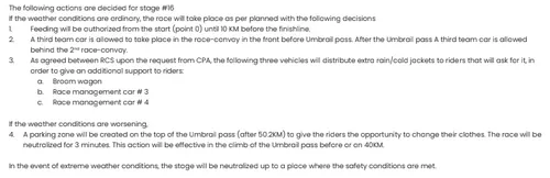 'Als de weersomstandigheden het toelaten om op een normale manier te koersen, zal de etappe zoals gepland doorgaan, maar dan wel met de volgende veiligheidsmaatregelen', luidt het statement van de organisatie. 'Ten eerste is de bevoorrading van renners toegestaan van bij de start tot tien kilometer van de finish. Daarbij komt dat de organisatie het gebruik van een derde ploegauto toestaat. Die zal voor de Umbrailpass (