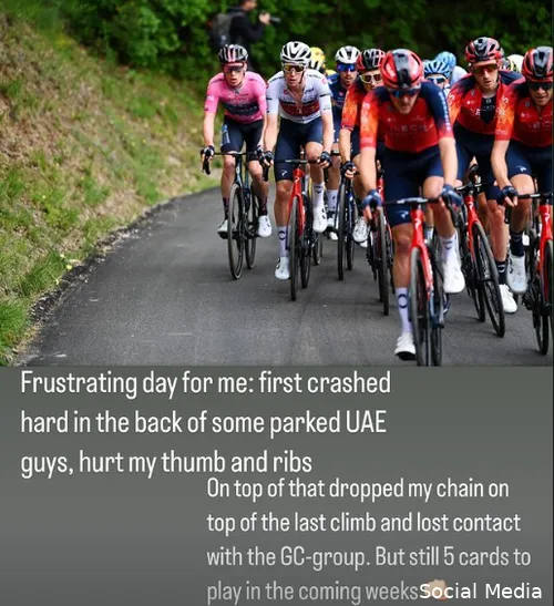 Instagramverhaal laat weten gevallen te zijn in het begin van de rit. Tot overmaat van ramp vloog in de ultieme slotfase ook nog zijn ketting eraf.
