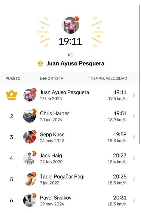 Sepp Kuss (Team Visma | Lease a Bike) – met maar liefst 40 seconden verpulverde. Met een gemiddelde snelheid van 19,5 km/u lijkt Ayuso in topvorm te komen. Hij ligt perfect op schema om zich te meten met de wereldtop in de Giro. Zijn goede klimvorm kan heel goed het resultaat zijn van zijn vernieuwde aanpak.