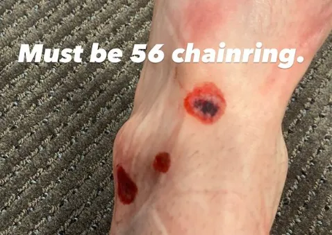 Must be 56 chainring', liet hij weten via Instagram met een lelijke foto van de schade.
