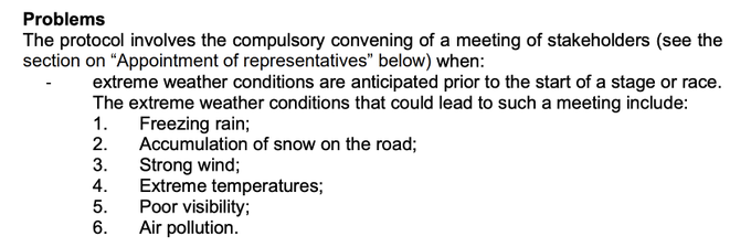 La Flamme Rouge meldde dat volgens Tuttobici de renners het extreem weer-protocol wilden activeren vanwege de sneeuwval en de regen die het peloton de hele dag moet doorstaan. Uiteindelijk werd dat verzoek dus gehonoreerd door de