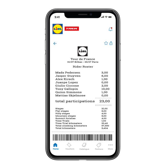 Lidl-Trek. Op de foto is een kassabon met daarop acht producten (de acht renners) te zien. Bij de prijs van het 'product' staat het aantal Tourdeelnames vermeld. Zo spant routinier