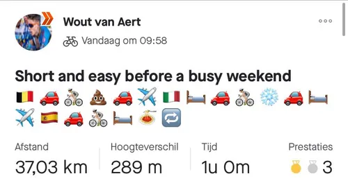 10 december 2021 - Als enige crosstopper neemt Wout van Aert dit weekend de moeite om zowel zaterdag (in het Belgische Essen) als zondag (Val di Sole, Italië, meer dan duizend kilometer verderop) aan de start van een cross te verschijnen. Om zich hier fysiek en mentaal op voor te bereiden, deed Van Aert vrijdag een korte work-out op Zwift. Het bijschrift was veelzeggend: zijn weekend samengevat in 21 emoticons. Origineel, dat zeker!