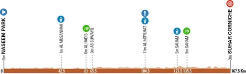 Tour of Oman werd afgetrapt met een rit van Al Rustaq naar de hoofdstad van het land, Musqat. Met 138 kilometer werd het geen lange dag op het zadel, maar makkelijk was het ook zeker niet. De laatste kilometer liep namelijk vals plat omhoog, waardoor de echte krachtpatsers overtuigend aan het front verschenen.