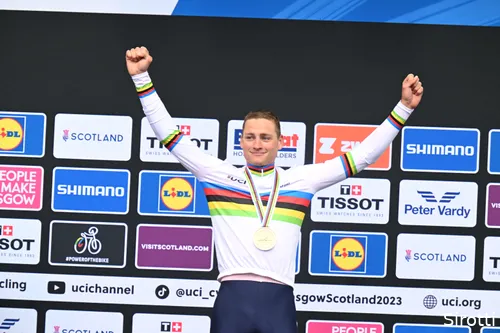 Nadat Van der Poel zijn voorjaar 2023 afsloot met een klinkende zege in Parijs-Roubaix, pakte hij 10 juni de draad weer op in Dwars door het Hageland. Met de Baloise Belgium Tour, Tour de France, een trainingsperiode in Spanje om de puntjes op de i te zetten richting Glasgow en de twee WK's volgden er twee drukke maanden, waarin de Nederlander zijn grote doel behaalde: wereldkampioen worden op de weg.