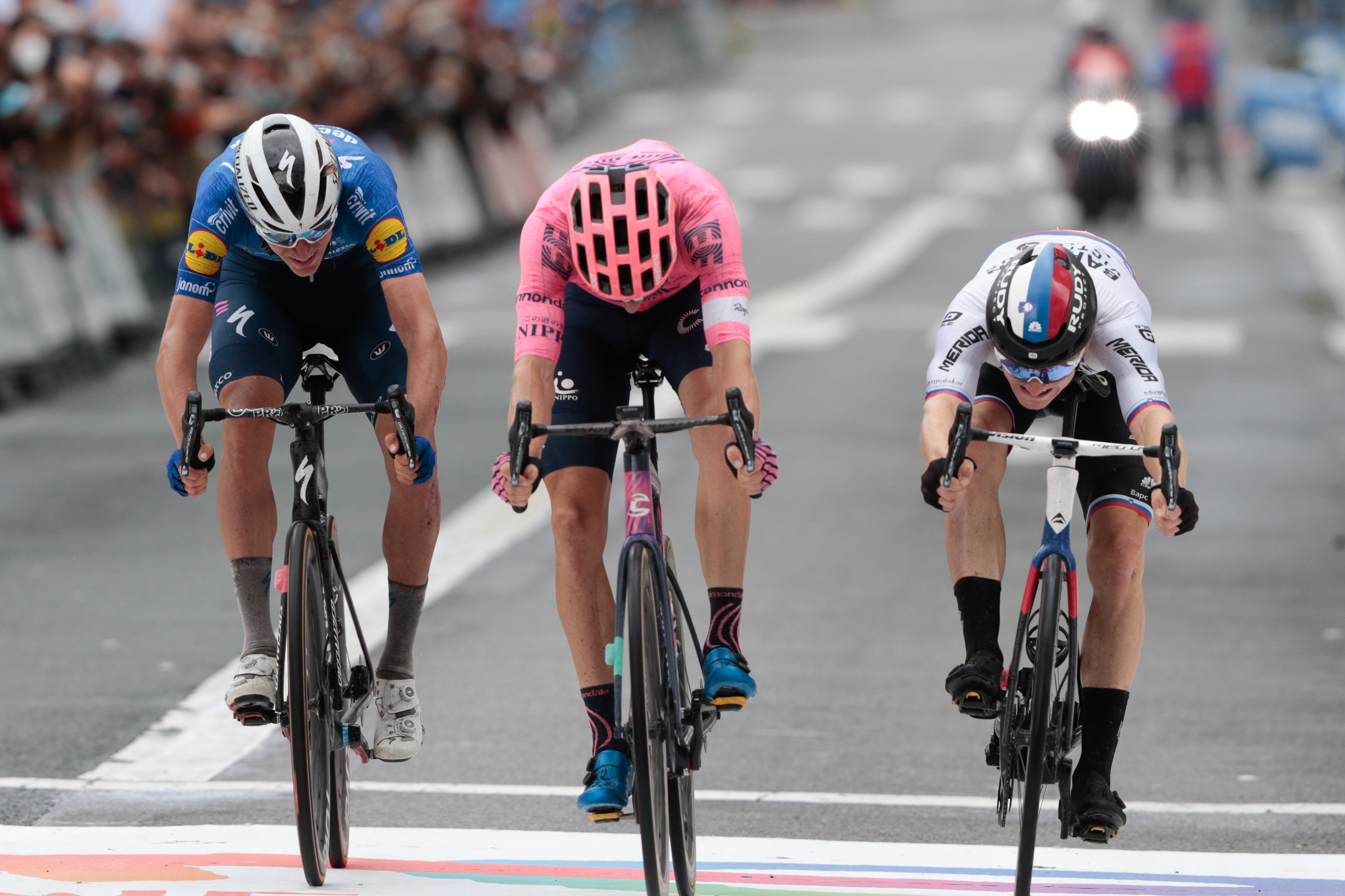 Clasica San Sebastian. De BORA-hansgrohe-kopman crashte in de regen hard met twee ploegmaats, maar leek op het eerste gezicht oké te zijn.