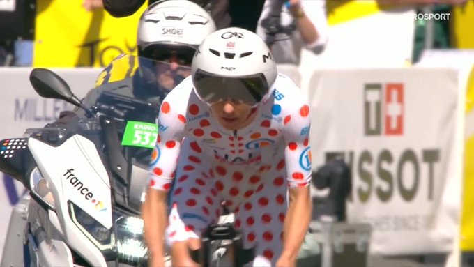 Pogacar ging als voorlaatste van start en meteen viel op dat de mouwen van zijn door de organisatie aangemeten bergklassement-tijdritpak niet aansloten. Aan de finish was ook duidelijk te zien dat er nog een hoop overtollig stof bij de buik zat. Het stond in schril contrast met de pijlsnelle tijdritpakken van Remco Evenepoel en Jonas Vingegaard, die geen verplichtingen hadden om in een tricot van de organisatie te rijden.