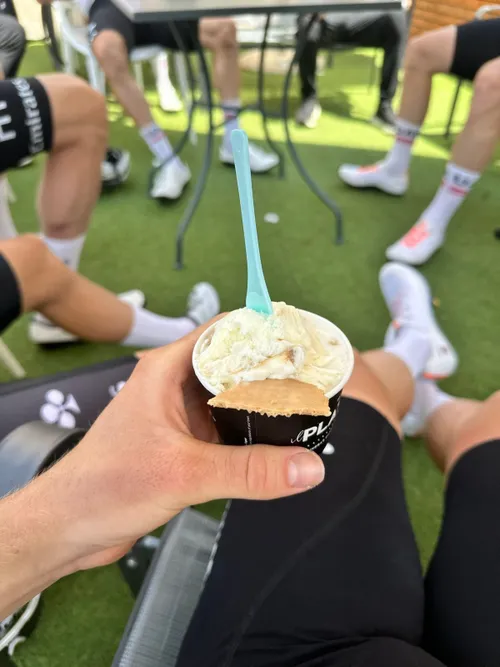 af in nog geen twee uur, waarbij hij met zijn ploeggenoten ook tijd vrij kon maken voor een heerlijk ijsje. 'In niemandsland zijn we gestopt, dat was heel mooi. En als lunch hadden we een lekkere burger. Stiekem hoop ik ook nog wel op een stuk pizza voor vanavond', lacht hij.