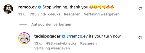 Remco Evenepoel om onder een Instagrambericht van de Sloveen van zich te laten horen, zij het op ludieke wijze.