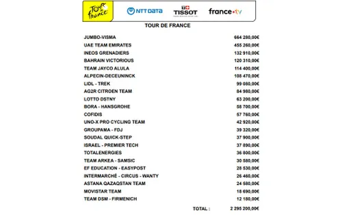 Tour de France ook het meeste prijzengeld gewonnen. De Nederlandse formatie neemt een cheque van ruim 660.000 euro mee naar huis, voornamelijk dankzij de eindzege van