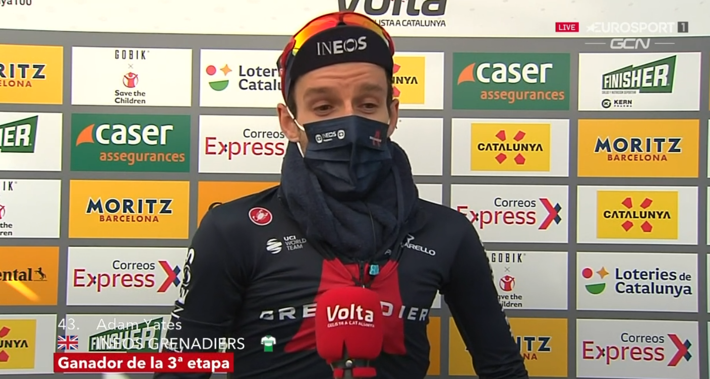 Adam Yates. De leider in koers kon wel genieten van een beetje rust, aangezien hij wel wat energie kan gebruiken voor de slotetappe. 'We hebben zoveel mogelijk energie voor morgen gespaard, want de etappe naar Barcelona gaat super zwaar worden. Ik heb het parcours al eens eerder verreden, dus ik weet hoe moeilijk het is', aldus Adam Yates op de