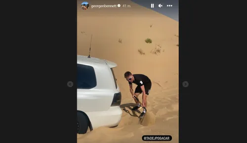 Insta-stories van George Bennett. Pogacar had het minder naar zijn zin, daar zijn jeep kwam vast te zitten en moest worden uitgegraven. Scheppen, Tadej!