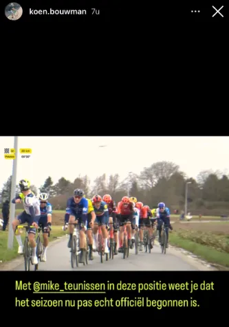 Altijd goed voor een dolletje, die kerel uit Ysselsteyn. Hij miste ondergetekende zaterdag bij de start in de Omloop en maakte daar met een kwinkslag gebruik van, maar kreeg de bal ook direct teruggekaatst. We zagen Teunissen namelijk wel redelijk wat in beeld tijdens de Omloop, maar dat was telkens met de blik naar achteren over de schouder heen. 'Met Mike in deze positie weet je dat het seizoen nu pas echt officieel begonnen is', merkte ex-ploegmakker Koen Bouwman dan ook op via Instagram.