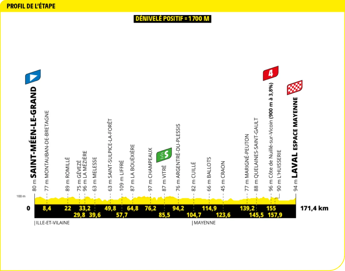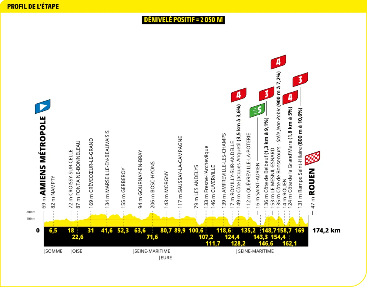 In totaal zijn er elf etappes die categorie 1 en 2 hebben meegekregen. De openingsrit met start en aankomst in Lille bijvoorbeeld, maar ook de tweede etappe met aankomst in Boulogne-sur-Mer (slotkilometer aan meer dan 5 procent), etappe vier met aankomst in Rouen (5 gecategoriseerde beklimmingen in slotfase) en zelfs de zesde etappe met aankomst op de Mur-de-Bretagne, 2 kilometer aan 6,9 procent.