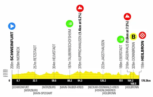 Ook dag twee zal het in Schweinfurt te doen zijn, met de start in de Duitse plaats. Na 176 kilometer finishen we in Heilbron, waar vooral de klim van Jägerhaus (1,6 km a 7,5%) cruciaal kan blijken. Deze topt namelijk op twaalf kilometer van het einde, inclusief listige uitloper.