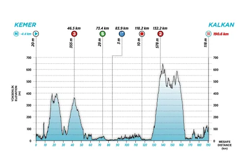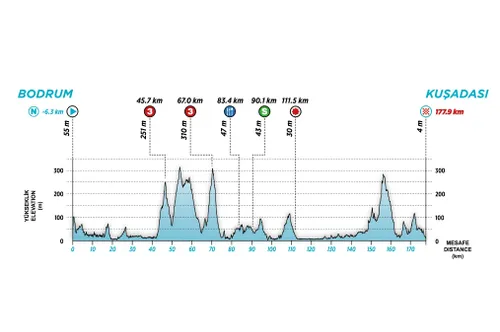 Ronde van Turkije was dan weer iets lastiger met twee categoriseerde klimmetjes. De eerste lag al vroeg in de etappe en bedroeg 4,3 kilometer aan bijna zeven procent gemiddeld, terwijl de top van de laatste klim pas op 65 kilometer van de finish lag. De tweede klim was echter elf kilometer lang, maar met zijn stijgingspercentage van vijf procent werd het toch moeilijk voor de klassementsmannen om het verschil te maken. Dat bleek, want Max Kanter won de rit als rappe man van een uitgedund peloton.