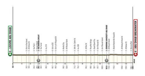 Wat de vierde rit was voor Dubai, is de zesde etappe voor die andere grote stad in de Verenigde Arabische Emiraten: Abu Dhabi mag die namelijk huisvesten. In 138 kilometer koers mogen we een veredeld criterium verwachten, mét spetterend einde. De spurters zijn namelijk opnieuw aan de beurt.