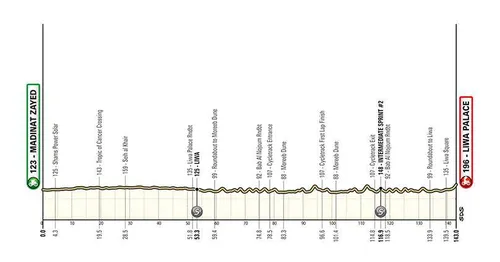 Etappe 1, maandag 19 februari: Al Dhafra Walk Madinat Zayed - Liwa Palace (143,0 km)