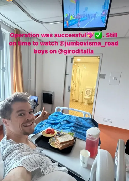 Instagram laten weten dat hij is geopereerd aan zijn knie. De hardrijder van Jumbo-Visma deelt een foto waarop te zien is dat hij in het ziekenhuis naar de Giro kijkt. Tratnik is zijn humor niet verloren, want hij geeft aan op tijd te zijn om Jumbo-Visma te steunen. Zijn herstel gaat nu dus echt beginnen.