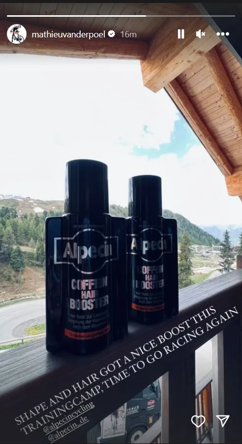 zijn Instagram kwam Van der Poel daar vanuit La Plagne donderdag nog eens op terug. 'Mijn vorm en haar hebben een mooie boost gehad tijdens dit trainingskamp', deelt hij mee bij een foto van enkele Alpecin-producten, uiteraard de hoofdsponsor van zijn formatie.