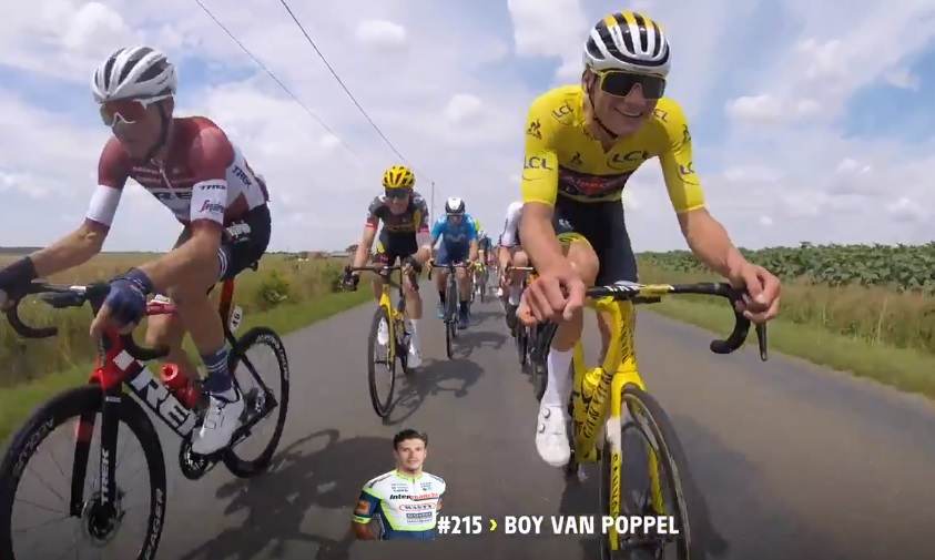 Mathieu van der Poel verloor zaterdag de gele trui, maar tijdens en na afloop van de etappe was de Nederlander nog in opperbeste stemming. De renner van Alpecin-Fenix kon zelfs terwijl hij aan het klimmen was nog een jongetje verblijden met zijn bidon, terwijl hij na afloop vertelde eigenlijk tot Parijs door te willen fietsen!