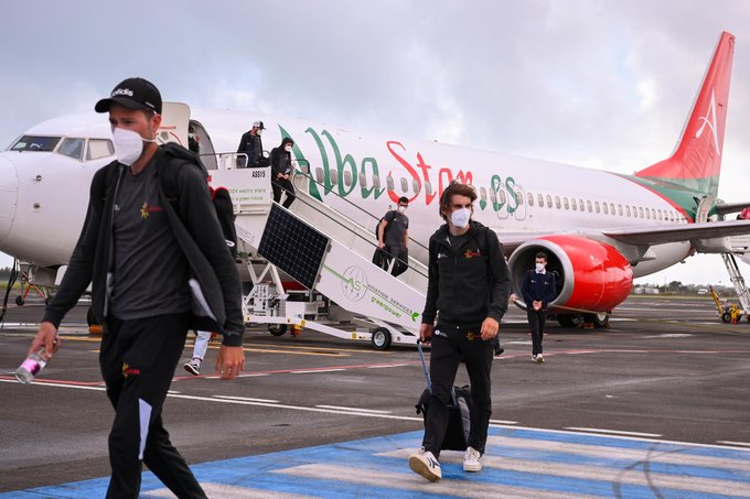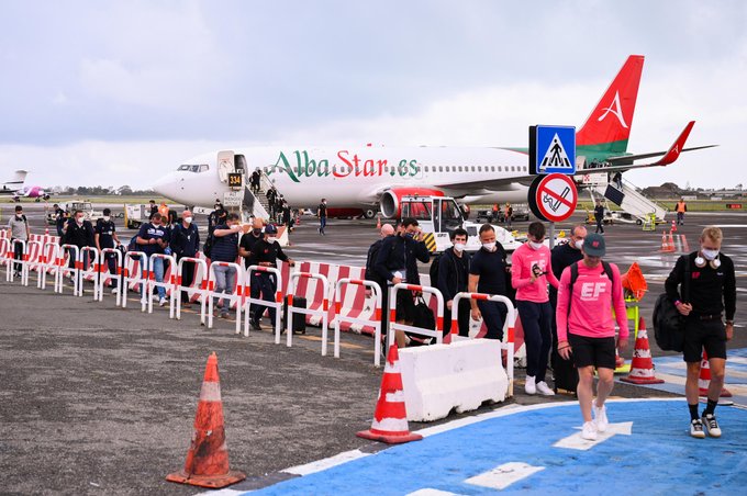 Mathieu van der Poel, toen het vliegtuig met Giro-renners maandag landde op Sicilië. Een flinke reis voor de renners, maar Van der Poel stond met een brede glimlach even bij