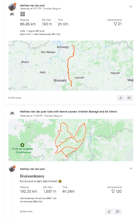 Mathieu van der Poel heeft zijn eerste wedstrijdkilometers er inmiddels opzitten met de Druivenkoers van woensdag, maar dat was niet genoeg voor de Nederlander van Alpecin-Deceuninck. Na afloop van de Belgische eendagswedstrijd fietste hij doodleuk 67 kilometer naar huis.