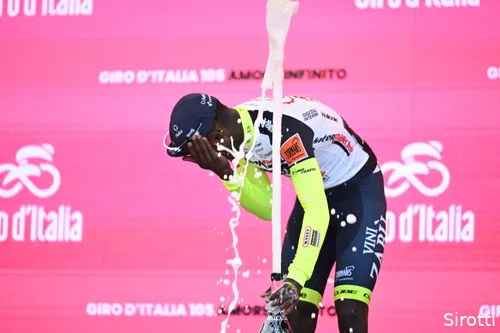 tiende rit wel te kloppen en was daar maar wat blij om. Op het podium jubelde hij van vreugde, tot het moment waarop de kurk van de proseccofles tegen zijn oog knalde. Het kurkincident betekende het einde van de Giro voor Girmay, die juist zo goed in vorm was.