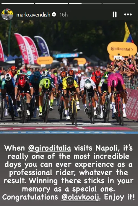 'Als de Giro naar Napels komt, is het één van de meest ongelofelijke dagen die je mee kan maken als professioneel wielrenner. Ongeacht wat je resultaat is. Daar winnen zal je voor altijd herinneren als een zeer speciale, dus proficiat Olav. Geniet ervan!', aldus de Brit van Astana Qazaqstan Team op zijn social media.