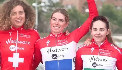 Anna van der Breggen in de SD Worx-kleuren straks tégen haar pupil Vollering rijdt.
