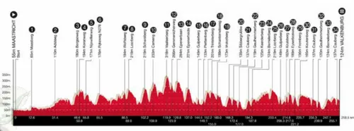 In de beginfase maakt het peloton, na de start op de Markt in Maastricht, een lus richting Sittard en Geleen. Vervolgens loopt de route via Ubachsberg, Simpelveld en Nijswiller terug richting het Heuvelland. Hier worden enkele iconische beklimmingen aangedaan waaronder de Loorberg en Camerig om vervolgens het letterlijke hoogtepunt te bereiken bij het Drielandenpunt in Vaals.