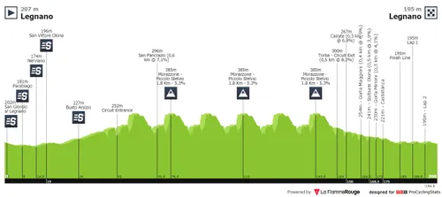 Na de laatste passage van deze heuvel moet er nog zo'n 45 kilometer bedwongen worden, waarvan de laatste twintig nagenoeg helemaal vlak zijn. Deze worden verreden middels een plaatselijke ronde in Legnano, waardoor de finish al twee keer verkend kan worden voor de daadwerkelijke eindstreep.