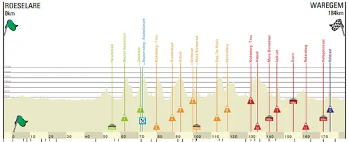 De resterende obstakels Nokereberg en Holstraat zorgen normaal gesproken niet voor een grote schifting namelijk, evenals de kasseistroken van Doorn en Herlegemstraat. De finish ligt na 184 kilometer getrokken in Waregem, al sinds jaar en dag aankomstplaats van deze wedstrijd.
