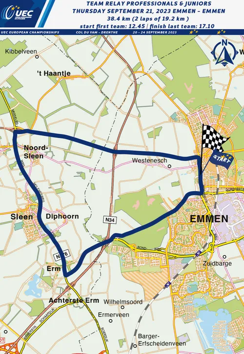 Veel hoeven we eerlijk gezegd niet te melden over het parcours van het EK Mixed Relay. De coureurs werken hetzelfde rondje af als dat de beloften een dag eerder voor hun individuele tijdrit deden, wat inhoudt dat zowel de mannen als vrouwen 19,2 kilometer afwerken.
