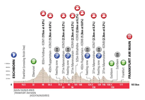 Escborn-Frankfurt was dus vaak een succesvolle koers voor de sprinters, maar dat neemt niet weg dat het parcours nog vervelend lastig is. Het parcours telt 187,5 kilometers en onderweg vinden de renners een aantal lastige beklimmingen. De eerste daarvan is de Feldberg: een klim van elf kilometer lang aan 4,8 procent gemiddeld, eindigend met kilometers van zes en zeven procent. Voor de sprinters zonder klimmersbenen kan dat dus serieuze problemen opleveren.