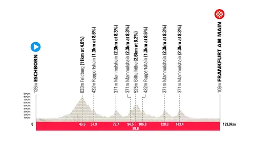 De route tussen startplaats Eschborn en de finish in Frankfurt telt 182,3 kilometer, met daarin verschillende heuveltjes opgenomen. De langste daarvan is de Feldberg, waarvan de top echter al na minder dan vijftig kilometer koers te vinden is. De beklimmingen die daarna volgen, zijn korter van stuk, maar wel een stuk steiler. Zo moeten de renners meerdere keren over de Mammolshain, die een gemiddeld stijgingspercentage van 8,3 procent bereikt.