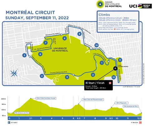In totaal moeten er achttien rondes verreden worden in Montreal, een stad in Oost-Canada. Voor de snelle rekenaars onder ons: dat is 269 per ronde, verdeeld over vier beklimmingen: de Cote de Camillien-Houde is daarvan de eerste en meteen ook zwaarste. Deze heuvel is 1,8 kilometer lang en heeft een gemiddeld stijgingspercentage van acht procent.
